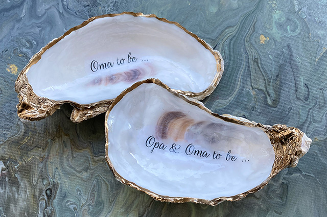 Via Liefzzz.nl kan je een gepersonaliseerde oester laten maken, om bijvoorbeeld te laten weten aan je ouders dat je zwanger bent en dat zij opa en/of oma zullen gaan worden.